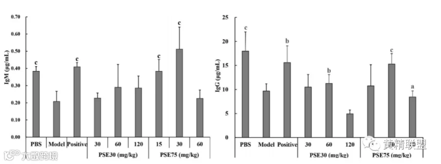 图2 PSE30和PSE75对血清IgG和IgM含量的影响。显著性差异:aP<0.05, bP<0.01, cP<0.001。