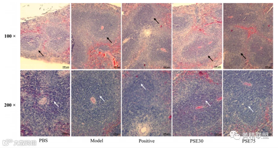 图6 PSE30和PSE75对小鼠脾脏形态和组织的影响。