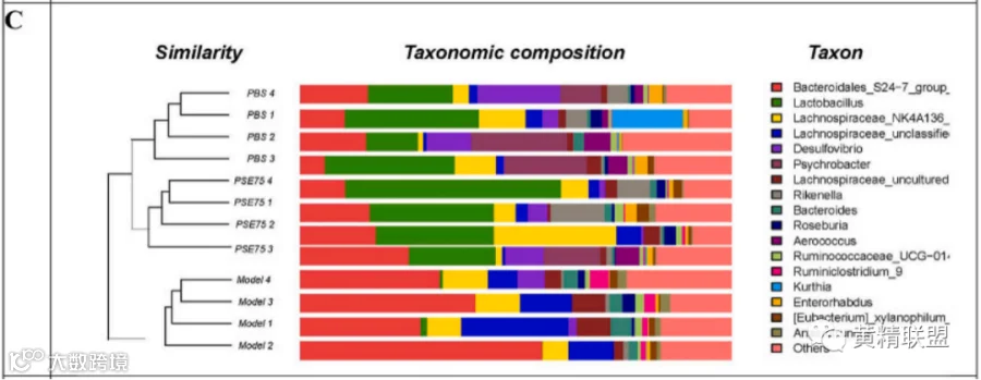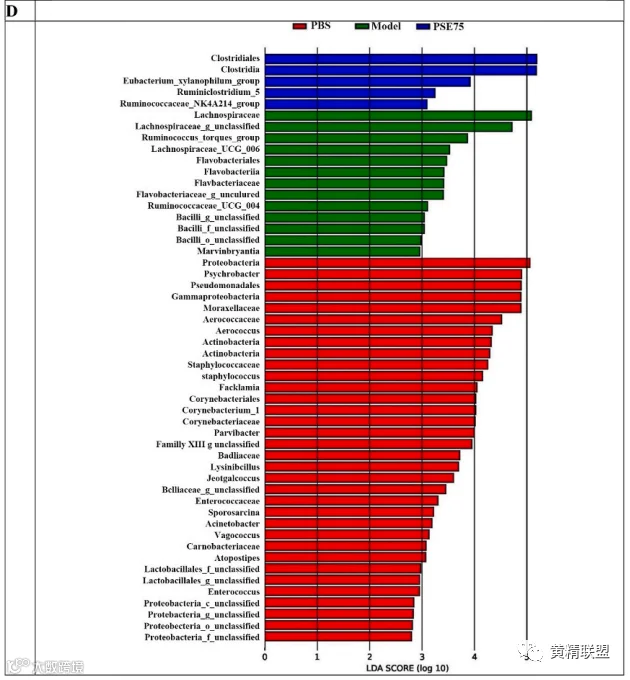图7 PSE75对微生物群落组成的影响。A:非度量多维测度结果B:属级微生物群落柱状图C:微生物群落柱状图与cluster-tree在属水平上的综合分析D:LEfSe分析结果。
