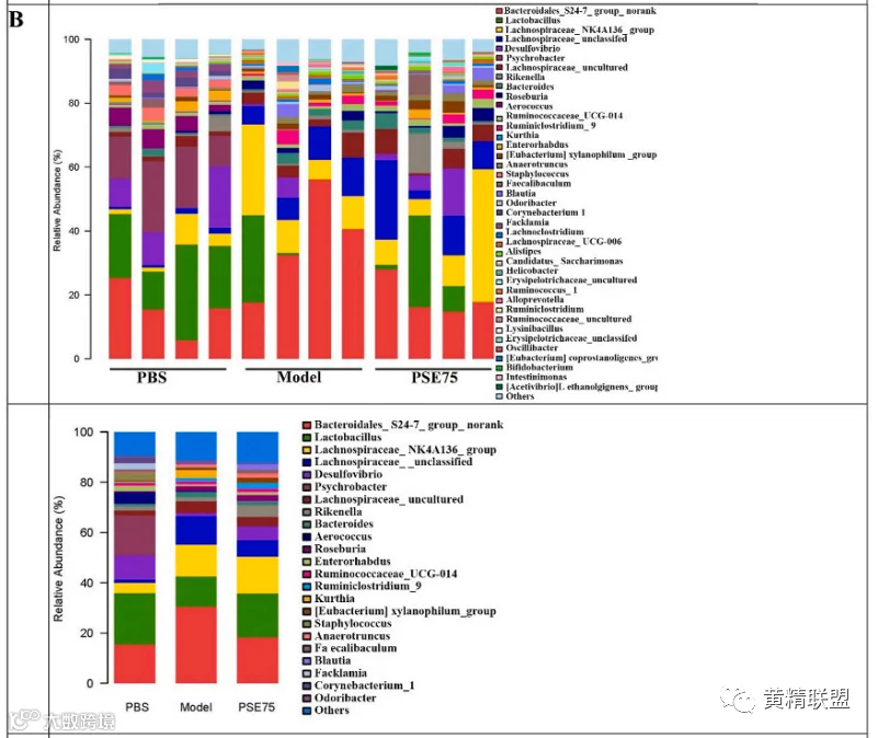 数据表明,PSE30和PSE75均能提高抗体IgG和IgM的含量,增强NK细胞对K562细胞的活性。经PSE30和PSE75处理的脾细胞中白细胞介素(IL)-2、干扰素(IFN)-γ、转录因子(STAT)4等Th1分子标记物(细胞免疫相关)和IL-4等Th2分子标记物(体液免疫相关)的mRNA表达均显著提高。除此之外,PSE30和PSE75还能增加小鼠体内白细胞、淋巴细胞、粒细胞数量,且PSE75的免疫调节作用优于PSE30。此外,PSE75可以改善小鼠的肠道微生物群落,与对照组相比,PSE75可降低肠道中拟杆菌(Bacteroidales)、毛螺菌(Lachnospiraceae)的相对丰度,提高乳酸菌(Lactobacillus)、脱硫弧菌(Desulfovibrio)、肠杆菌(Enterorhabdus)的相对丰度,说明这些微生物菌群可能在PSE75的免疫调节活性中发挥重要作用。同时,PSE75还能激活RAW264.7细胞分泌IL-6、IL-12p40、IL-10等细胞因子来提高小鼠免疫力。