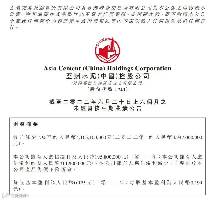 8月9日,亚洲水泥(中国)公布截至二零二三年六月三十日止六个月之未经审核中期业绩公告。公告显示,亚洲水泥今年上半年收益减少17%至约人民币4,105,100,000元(二零二二年:约人民币4,947,000,000元)。公司拥有人应占溢利为人民币195,800,000元(二零二二年:公司拥有人应占溢利约为人民币311,900,000元)。公司拥有人应占溢利减少,主要由于本公司产品售价下降所致。