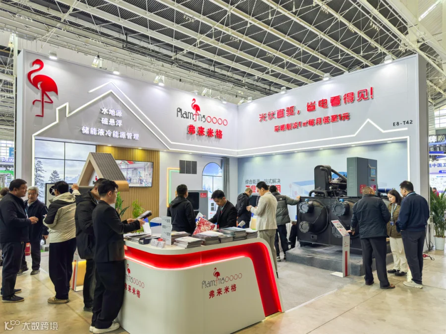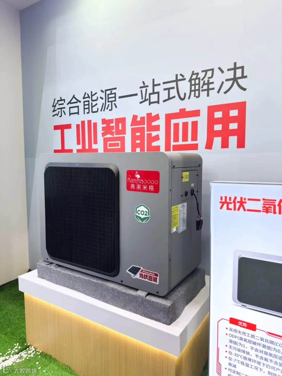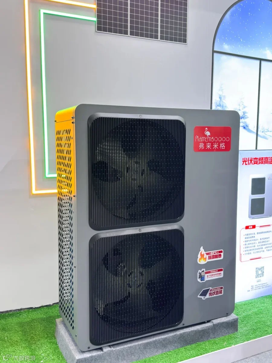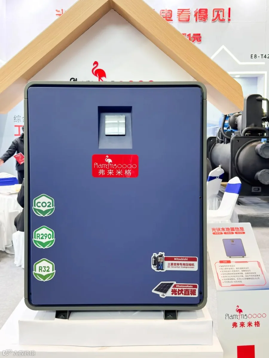 弗来米格携光伏直驱高温空气源热泵(80℃出水)、光伏直驱水地源热泵、光伏直驱二氧化碳热泵、储能液冷机组、磁悬浮变频离心式冷水机五款创新热泵产品,亮相E8馆T42展位,以“光伏直驱·绿电供暖”为主题,成为展会现场瞩目的焦点。