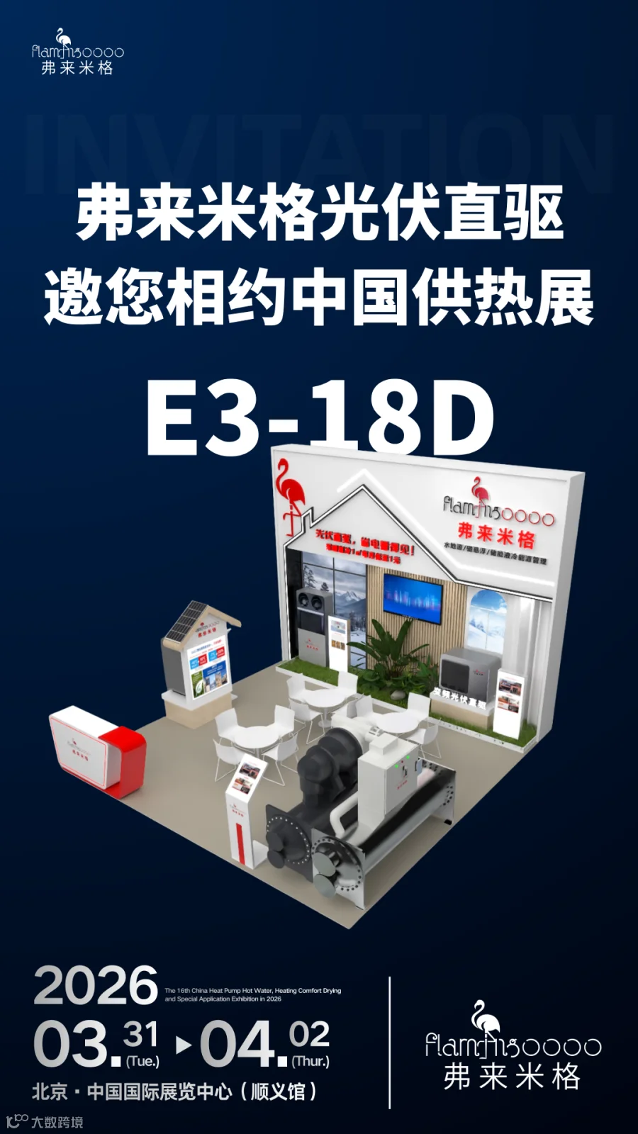 3月31日至4月2日,弗来米格将亮相中国供热展,北京·中国国际展览中心(顺义馆)E3-18D展位,欢迎各界朋友莅临交流,共同见证绿电供暖新时代。