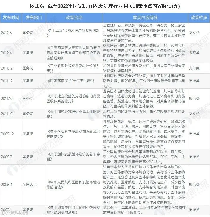 2005年,《中华人民共和国固体废物环境污染防治法》正式实施,“十一五”期间国家政策主要鼓励对固体废物实行回收和利用、减少固体废物生产量;“十二五”时期,《关于建立完整的先进的废旧商品回收体系的意见》出台,我国开始加强对固体废物进口的监管,同时深入推进大宗固体废物综合利用,加强共性关键技术研发及推广;“十三五”时期,《“无废城市”建设试点工作方案》、《工业固体废物资源综合利用评价管理暂行办法》等政策出台,提出要全面整治历史遗留尾矿库,统筹推进大宗固体废弃物综合利用,鼓励专业化第三方机构从事固体废物资源化利用相关工作;“十四五”以来,低碳化进程推进的带动下,固废处理相关国家政策进一步优化,支持力度进一步加大,全面禁止进口固体废物,继续加强大宗固废综合利用,大力开展“无废城市”建设,固废处理行业发展进入快车道。