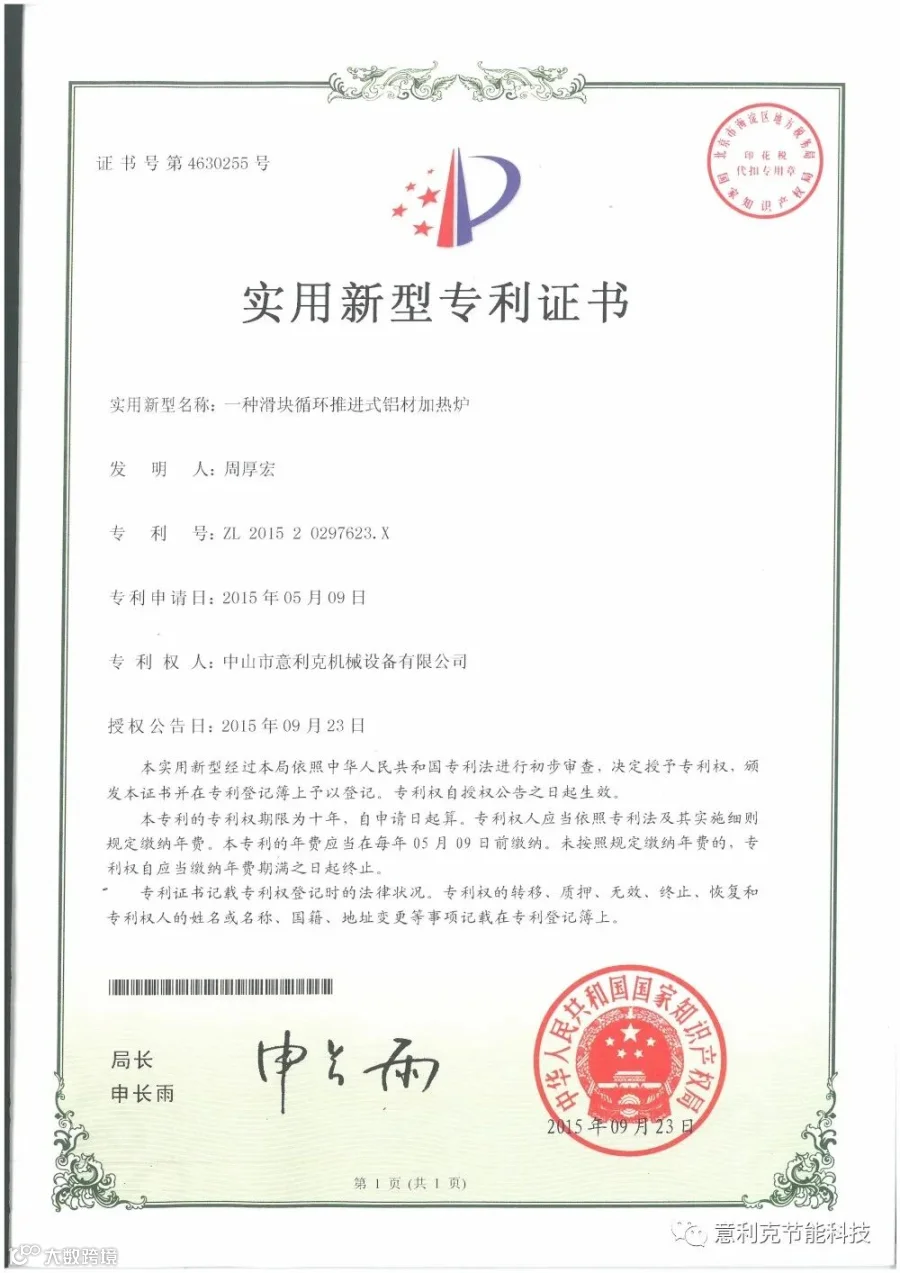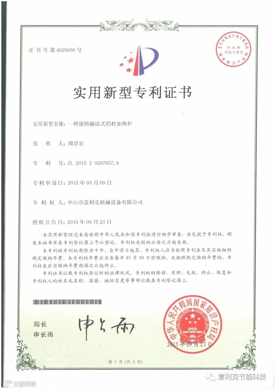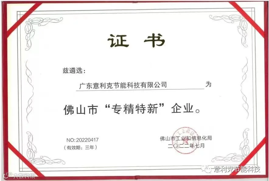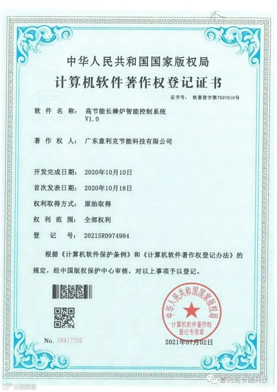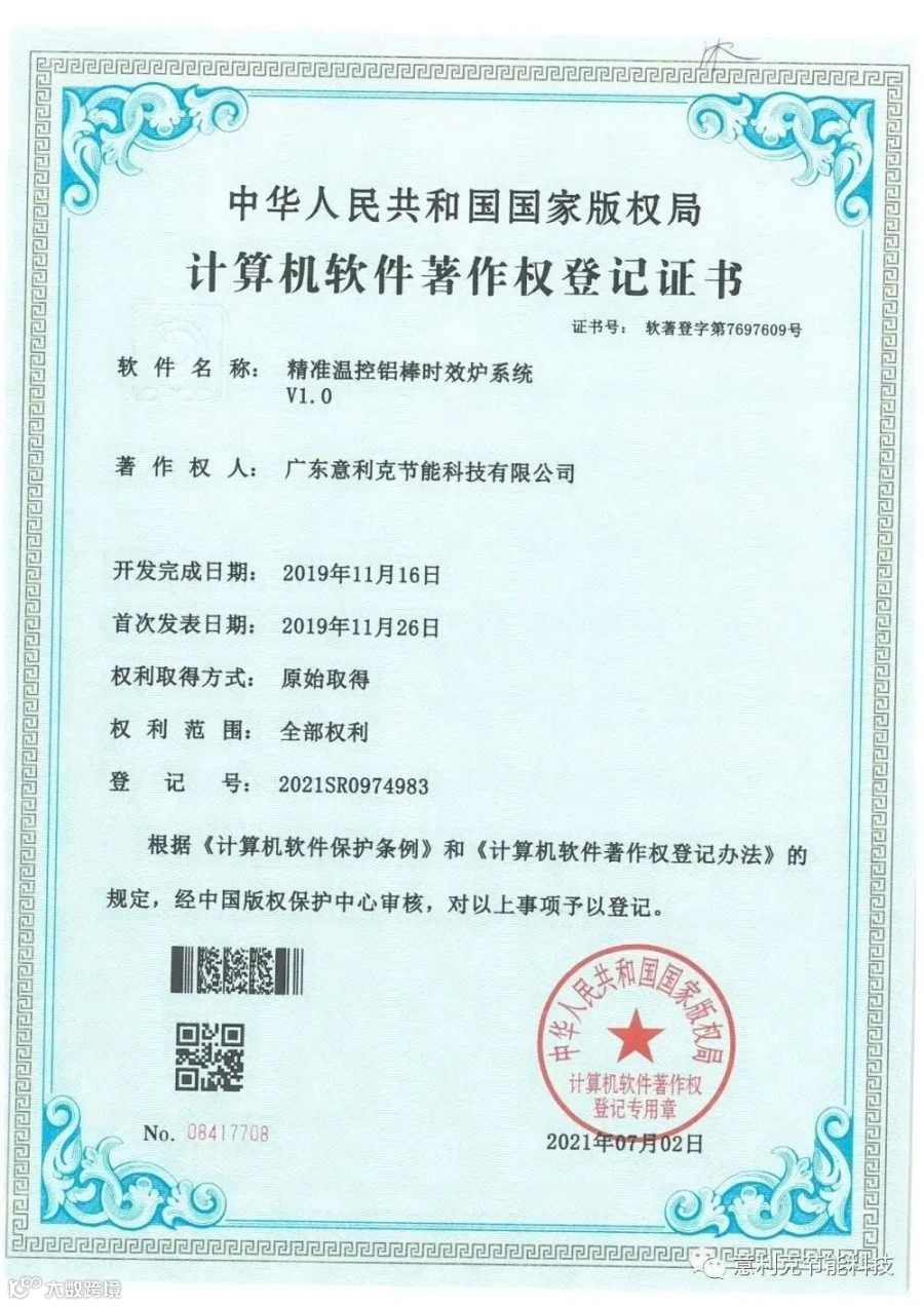 2016年意利克智控高节能长棒炉被认定为高新技术产品。2017年精准控温时效炉取得技术突破,温度均衡控制到±1℃范围内。2018年高端装备(智控高节能短棒炉)入库,并获得首台高额补助。2019年意利克(佛山)公司成立。得到客户支持和认可。2020年连续获得“十佳厂商、卓越品牌”等奖项。2021年连续蝉联为高新技术企业。2022年遴选为“专精特新”企业和“创新型企业”。