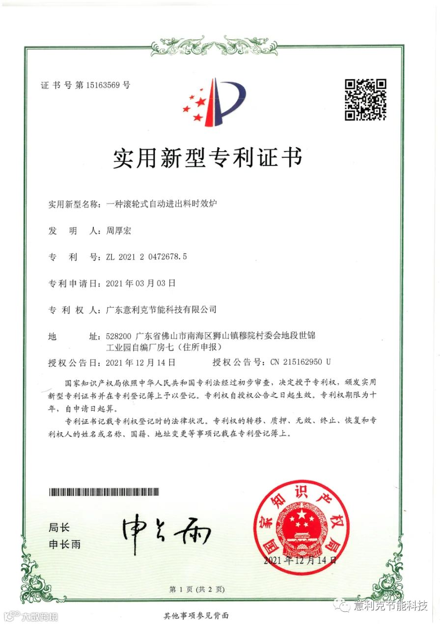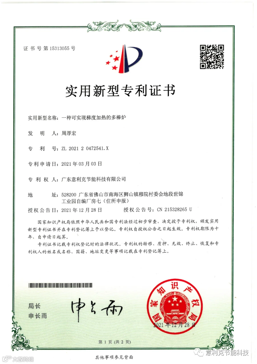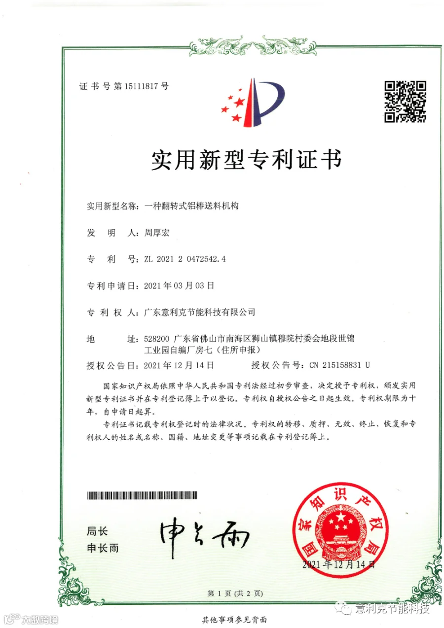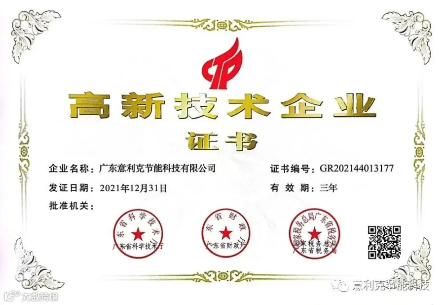 2016年意利克智控高节能长棒炉被认定为高新技术产品。2017年精准控温时效炉取得技术突破,温度均衡控制到±1℃范围内。2018年高端装备(智控高节能短棒炉)入库,并获得首台高额补助。2019年意利克(佛山)公司成立。得到客户支持和认可。2020年连续获得“十佳厂商、卓越品牌”等奖项。2021年连续蝉联为高新技术企业。2022年遴选为“专精特新”企业和“创新型企业”。