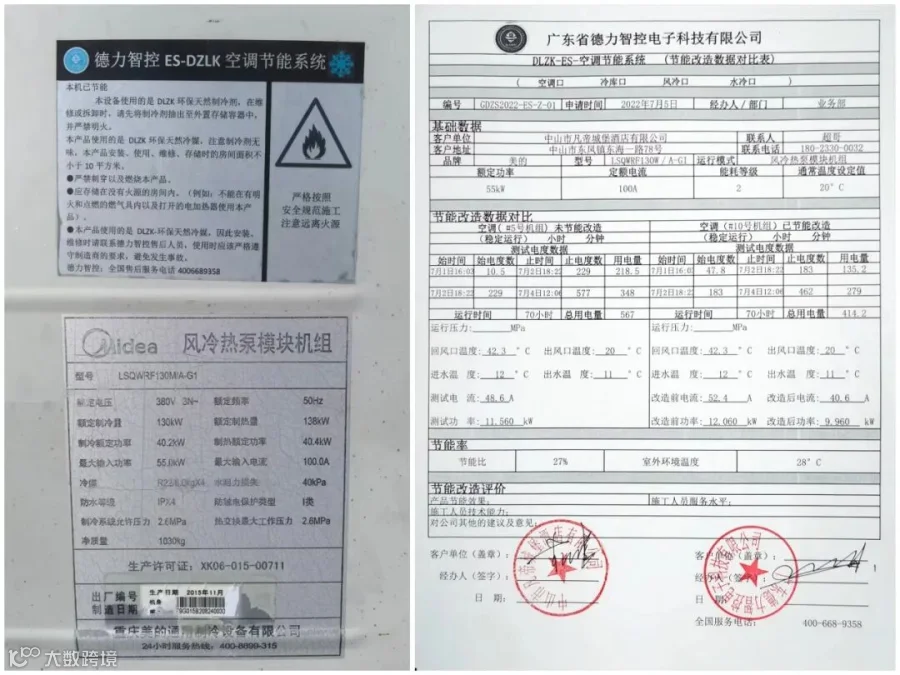 因此,对于酒店等需要为客人提供稳定舒适环境的场所来说,制冷空调是刚性且高能耗的需求,设备运行时间长,电费开支压力巨大。2022年,德力智控为酒店进行全面节能改造,实测节能率为27%。