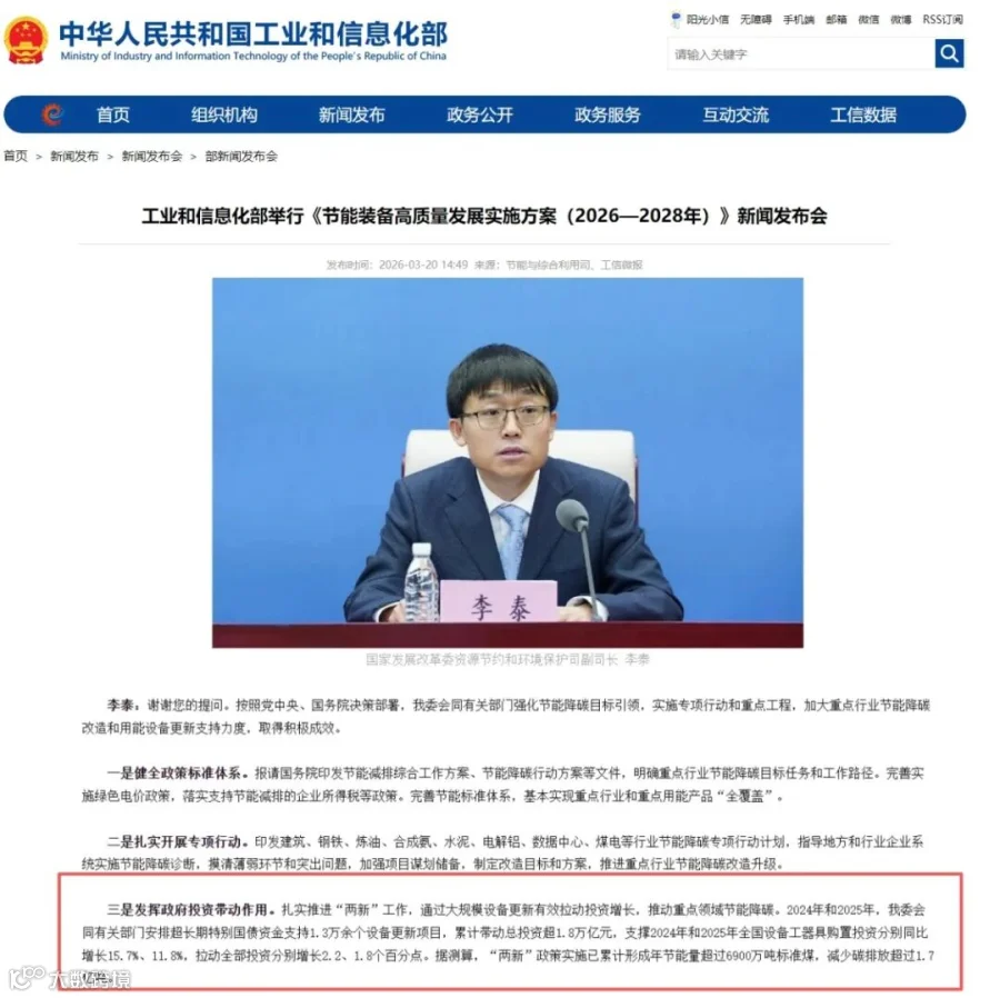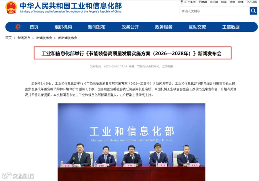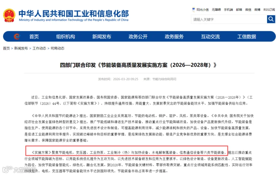 2026年3月20日,工业和信息化部、国家发展改革委、国务院国资委、国家能源局联合发布《节能装备高质量发展实施方案(2026—2028年)》。