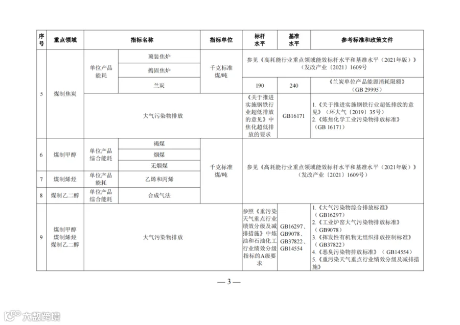 对标国内外同行业先进水平,以及国家现行政策、标准中先进能效指标值和最严格污染物排放要求,确定煤炭清洁高效利用重点领域标杆水平。坚持绿色低碳发展理念,统筹考虑实现碳达峰目标要求、促进煤炭消费转型升级、便于企业操作实施等因素,参考国家现行标准中的准入值或限定值,以及国家政策文件明确的相关指标,科学确定煤炭清洁高效利用重点领域基准水平。本文件将视行业发展和标准制修订情况进行补充完善和动态调整,适时建立包括能耗、物耗、水耗、污染物和温室气体排放水平等在内的煤炭清洁高效利用综合评价指标体系。
