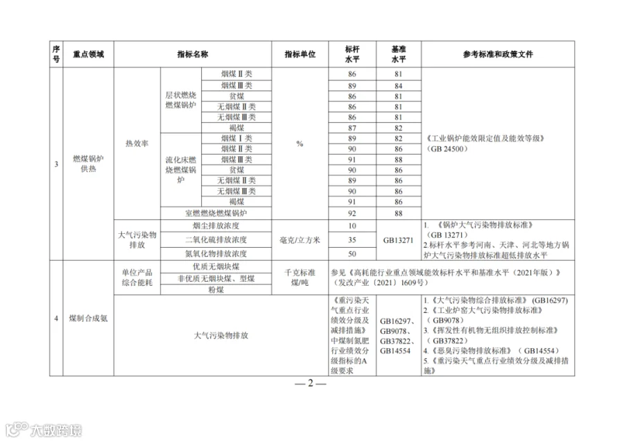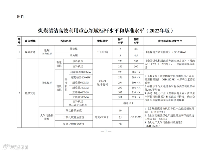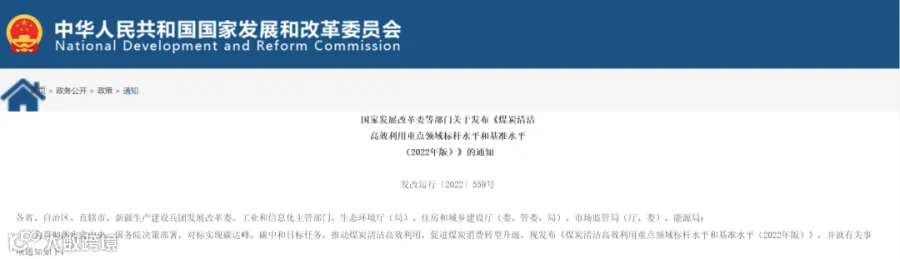 为贯彻落实党中央、国务院决策部署,加快推进煤炭清洁高效利用,促进煤炭消费转型升级,助力推进清洁低碳安全高效的能源体系建设和实现碳达峰目标,近日,国家发展改革委联合工业和信息化部、生态环境部、住房和城乡建设部、市场监管总局、国家能源局印发通知,发布了《煤炭清洁高效利用重点领域标杆水平和基准水平(2022年版)》。