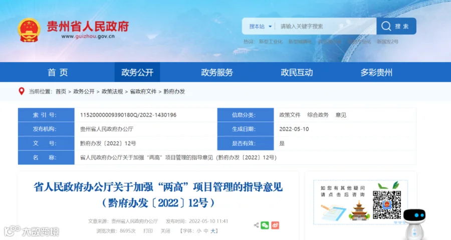 5月10日,贵州省人民政府发布了《关于加强“两高”项目管理的指导意见》。