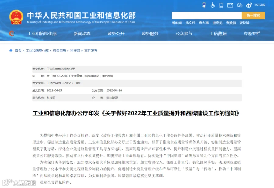 工业和信息化部办公厅26日印发《关于做好2022年工业质量提升和品牌建设工作的通知》。通知明确了2022年推动质量提升的四大重点行业,分别是原材料行业、装备行业、消费品行业、电子信息行业。