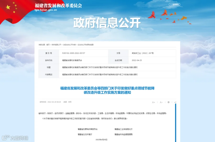 近日,福建省发改委、省工信厅、省生态环境厅、省市场监督管理局四部门联合出台《关于做好重点领域节能降碳改造升级工作的实施方案》,聚焦福建省一批重点领域率先开展节能降碳改造升级工作。