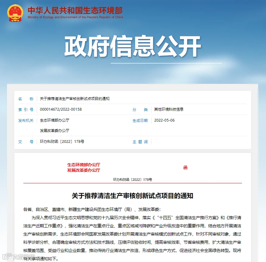 为强化清洁生产在重点行业、重点区域减污降碳和产业升级改造中的重要作用,结合地方开展清洁生产审核创新需求,近日,生态环境部会同国家发展改革委启动清洁生产审核模式创新试点项目征集,针对不同审核对象,通过科学诊断分析、合理确定审核方式方法和技术路线,压缩评估验收时间、提高审核效率、节省审核费用,扩大清洁生产审核覆盖范围、受益行业和企业数量,推动传统行业清洁生产改造,形成绿色生产方式,促进经济社会全面绿色转型。
