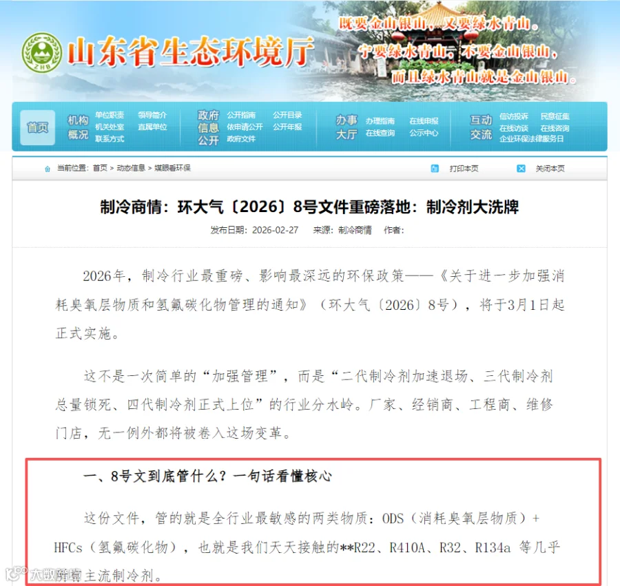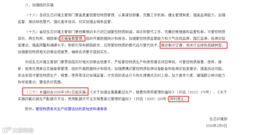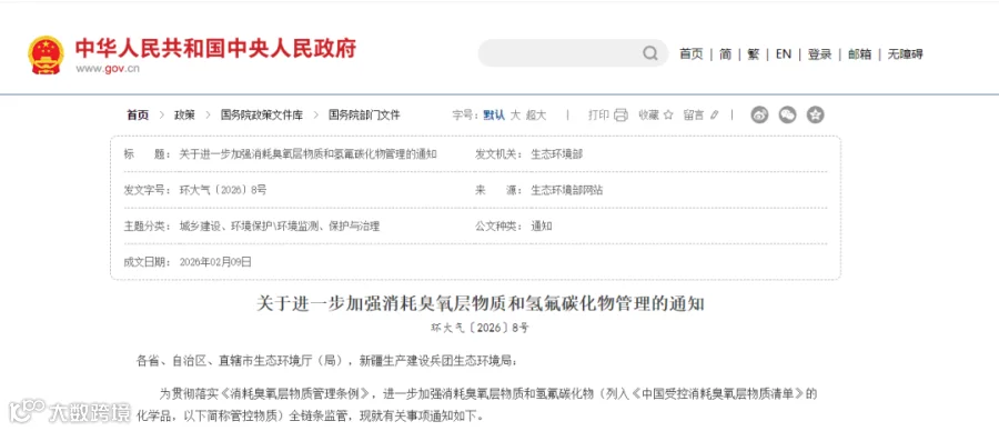 3月1日,生态环境部《关于进一步加强消耗臭氧层物质和氢氟碳化物管理的通知》(环大气〔2026〕8号)正式实施。