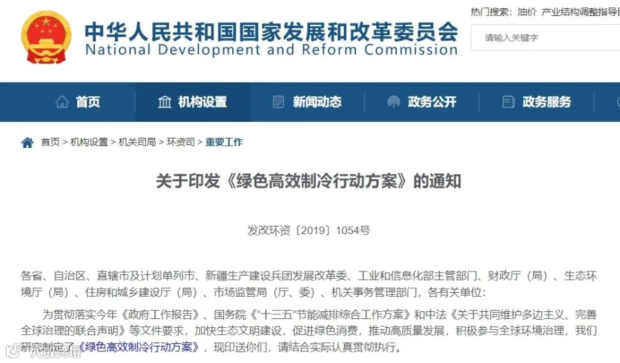 2019年,国家发改委、工信部等七部门联手印发了《绿色高效制冷行动方案》,方案中指出,到 2030 年,大型公共建筑制冷能效提升30%,制冷总体能效水平提升 25%以上,绿色高效制冷产品市场占有率提高 40%以上,实现年节电 4000 亿千瓦时左右。