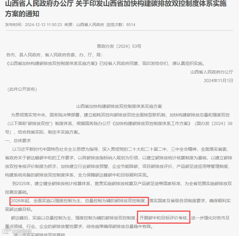 “双控”制度全面推行:多地政府(如山西)已将碳排放总量与强度“双控”指标分解至基层。面临明确的减排任务分解。