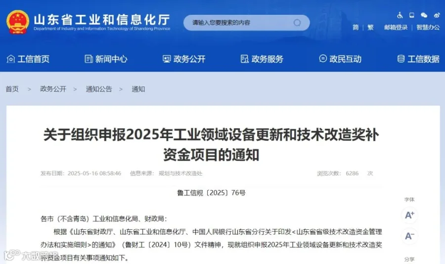 5月15日,山东省工业和信息化厅、财政厅发布《关于组织申报2025年工业领域设备更新和技术改造奖补资金项目》的通知。