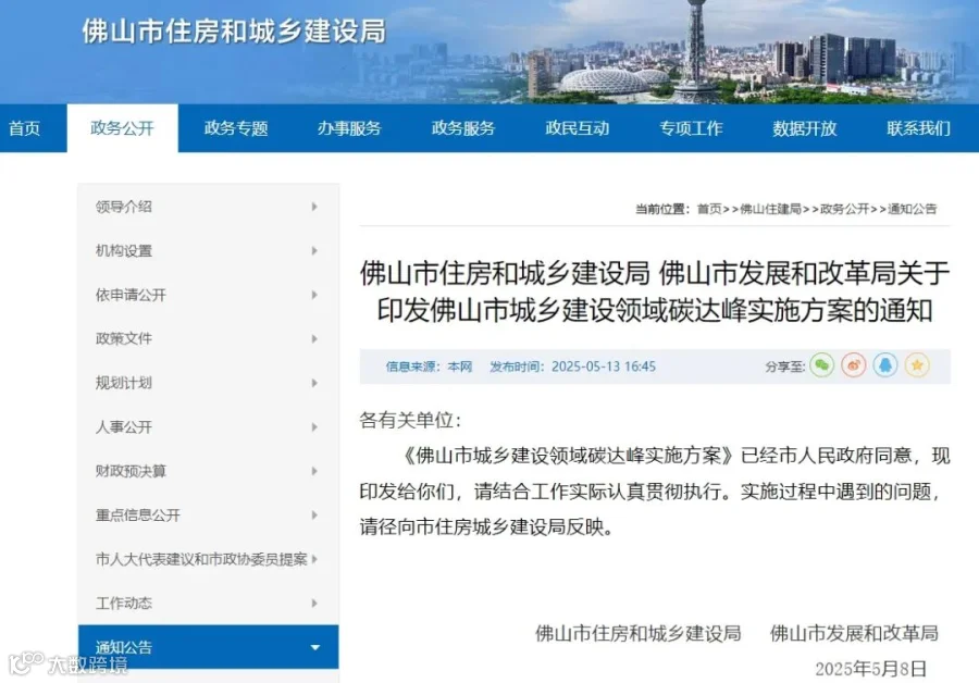 5月13日,佛山市住房和城乡建设局、发展和改革局聚焦建筑节能改造、绿色建筑推广、可再生能源应用等重点任务,联合印发了《佛山市城乡建设领域碳达峰实施方案》。(以下简称:《佛山碳达峰方案》)