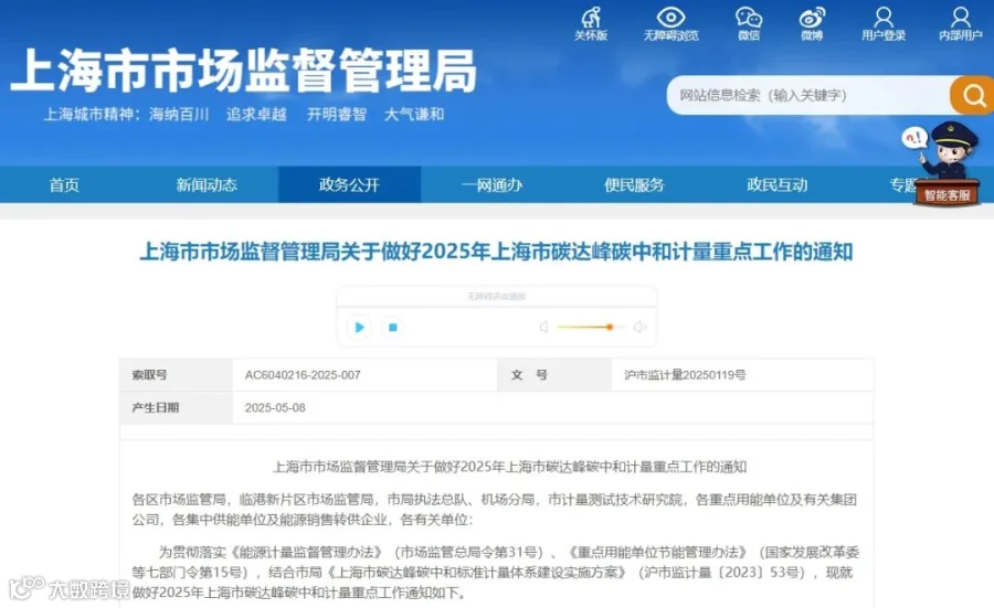 5月8日,上海市监督管理局发布《关于做好2025年上海市碳达峰碳中和计量重点工作》了通知,明确提出鼓励在重点领域、重点区域开展能源资源计量示范试点,要完善碳排放计量标准体系,支持保障本市加快打造绿色低碳供应链。