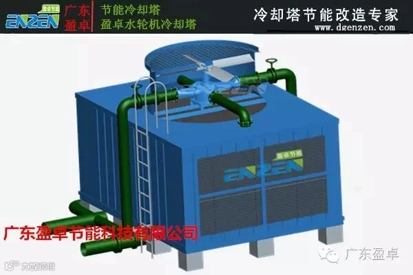 冷却塔节能技改技术的核心是水轮机取代冷却塔原来电机、减速器、传动轴等部件,把系统中被浪费的多余的动能转化为机械能,直接带动风扇转动。对能被改造的冷却塔而言实现100%的节能。