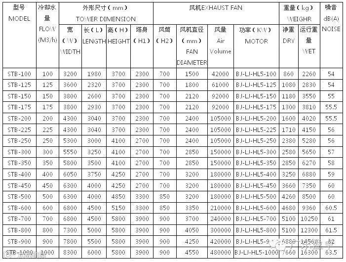 注: 1、该系列冷却塔设计工况为:干球温度31.5℃、湿球温度27℃、进水温度37℃、出水温度32℃、大气压力99400pa。
