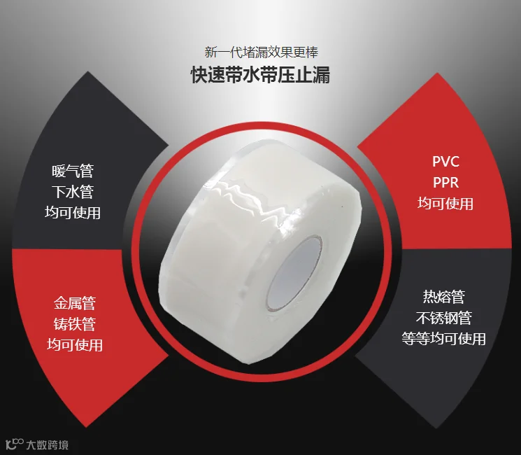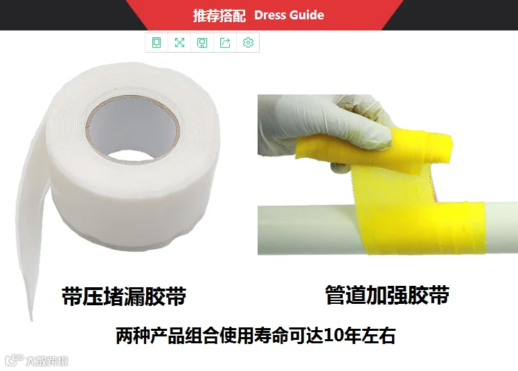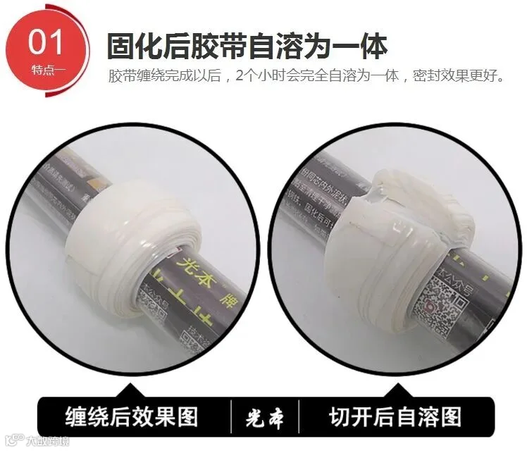 当管道泄漏,阀门损坏无法关闭时用本品缠绕后自动收缩冷硫化成一体达到堵漏目的。本品不用工具,用双手在泄露部位缠绕6层以上,缠绕后层与层之间靠压力起化学反应自动硫化为一体,相当于在管道外面做个堵漏箍一样,缠绕后无法一层层拆卸下来,只能用钢锯条或者壁纸刀整体切割下来。本品食品级,无异味无腐蚀无污染可使用在家庭水管食品酿酒等厂家管道,并且在石油化工发电冶炼船舶等工业管道上也可以使用。