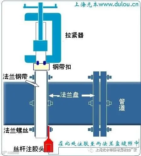 4、把法兰卡带套在两法兰周圈上(如扎裤腰带)并用G9-60强力堵漏拉紧器将法兰卡带拉紧;