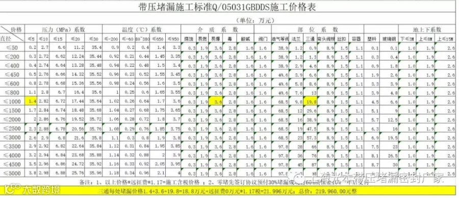 (1)介质为易燃易爆、有毒有害的,高温400℃高以上,高压9MPa以上的,施工价格标准为每个泄漏使用材料的出厂价格X系数20=施工价格X1.17=含17%税票价格;
