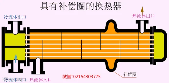 当两流体的温度差较大时,可在换热器的外壳适当位置上焊上一个补偿圈(或膨胀节)。当外壳和管线不同时,补偿圈发生弹性形变、拉伸或压缩,以适应外壳和管不同的热膨胀程度,它适用于两流体温差不大于70℃,壳程流体压强不高于600kPa的场合。