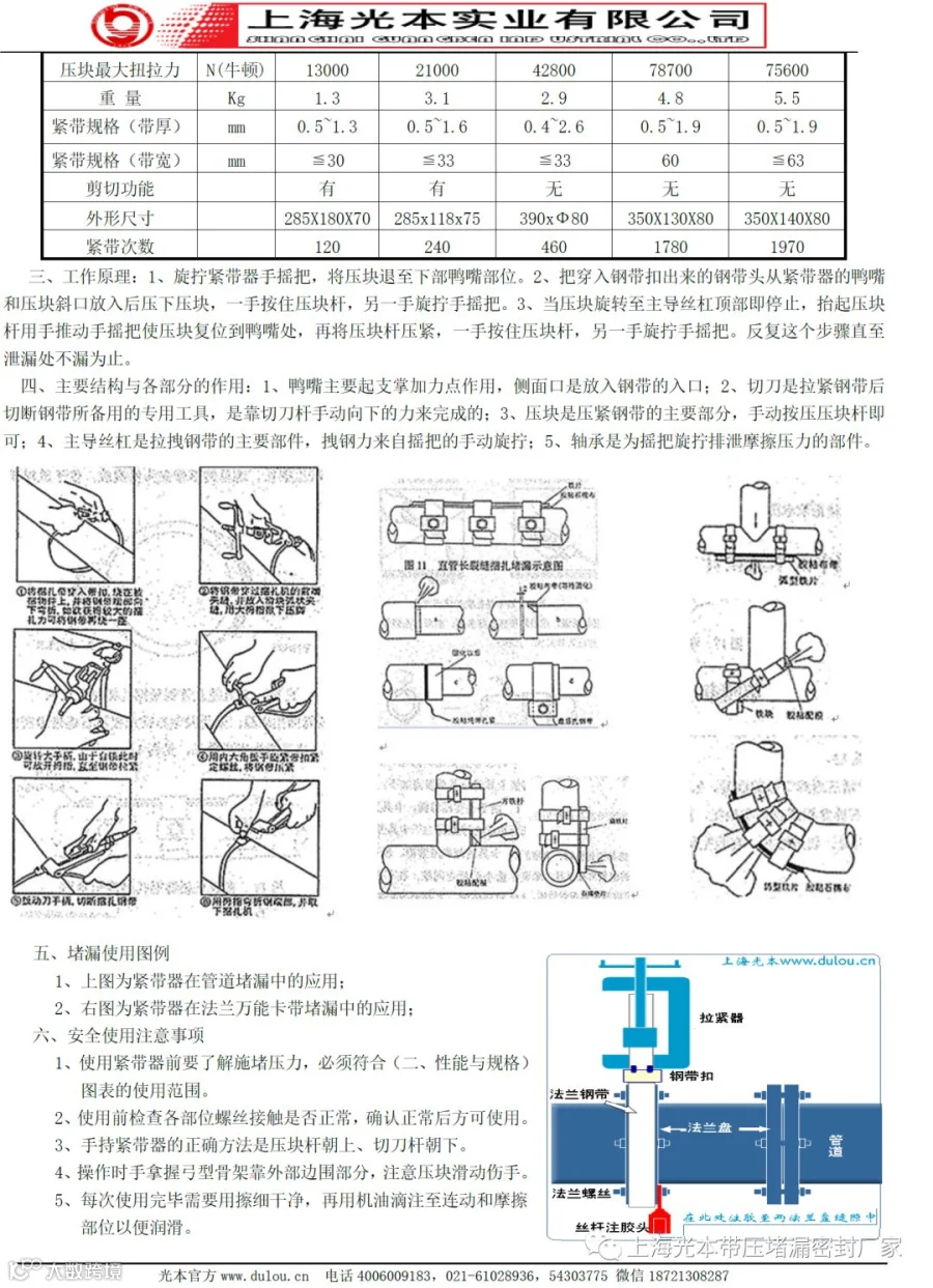 一、简 介: 堵漏钢带紧带器、堵漏钢带拉紧器简称紧带器或紧带器,带压堵漏行业内有十种技术工艺,本品为十种技术内一种钢带拉紧技术中的专用工具,执行标准Q/05082GBDDC ,本品是各类管道管网穿孔泄漏后用来带压堵漏的工具,具体应用在光本钢带拉紧技术工艺之上,可以快速将钢带拉紧制止泄漏,动力为手动旋转,小型,携带方便、操作简单、应用范围广。