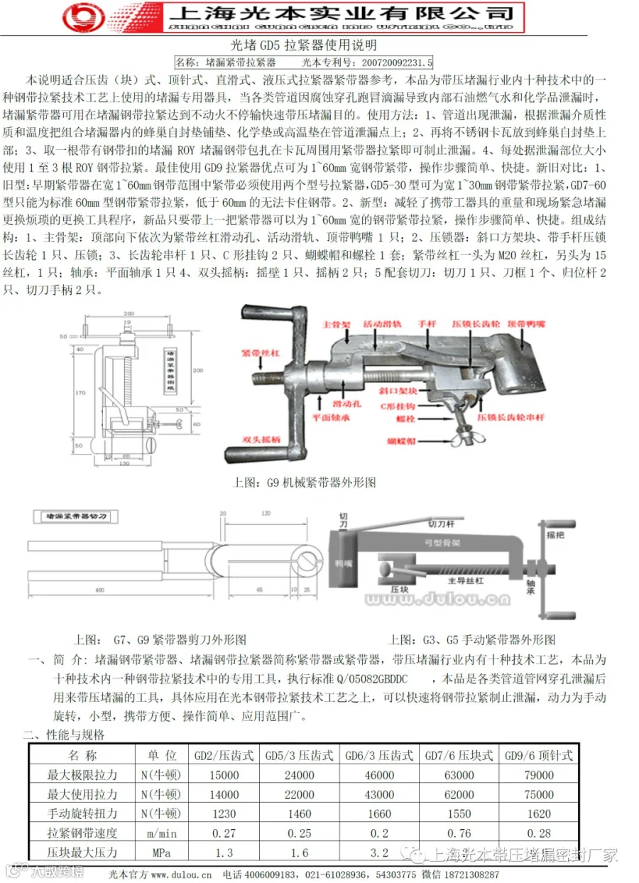 本说明适合压齿(块)式、顶针式、直滑式、液压式拉紧器紧带器参考,本品为带压堵漏行业内十种技术中的一种钢带拉紧技术工艺上使用的堵漏专用器具,当各类管道因腐蚀穿孔跑冒滴漏导致内部石油燃气水和化学品泄漏时,堵漏紧带器可用在堵漏钢带拉紧达到不动火不停输快速带压堵漏目的。使用方法:1、管道出现泄漏,根据泄漏介质性质和温度把组合堵漏器内的蜂巢自封垫铺垫、化学垫或高温垫在管道泄漏点上;2、再将不锈钢卡瓦放到蜂巢自封垫上部;3、取一根带有钢带扣的堵漏ROY堵漏钢带包扎在卡瓦周围用紧带器拉紧即可制止泄漏。4、每处据泄漏部位大小使用1至3根ROY钢带拉紧。最佳使用GD9拉紧器优点可为1~60mm宽钢带紧带,操作步骤简单、快捷。新旧对比:1、旧型:早期紧带器在宽1~60mm钢带范围中紧带必须使用两个型号拉紧器,GD5-30型可为宽1~30mm钢带紧带拉紧,GD7-60型只能为标准60mm型钢带紧带拉紧,低于60mm的无法卡住钢带。2、新型:减轻了携带工器具的重量和现场紧急堵漏更换烦琐的更换工具程序,新品只要带上一把紧带器可以为1~60mm宽的钢带紧带拉紧,操作步骤简单、快捷。组成结构:1、主骨架:顶部向下依次为紧带丝杠滑动孔、活动滑轨、顶带鸭嘴1只;2、压锁器:斜口方架块、带手杆压锁长齿轮1只、压锁;3、长齿轮串杆1只、C形挂钩2只、蝴蝶帽和螺栓1套;紧带丝杠一头为M20丝杠,另头为15丝杠,1只;轴承:平面轴承1只4、双头摇柄:摇壁1只、摇柄2只;5配套切刀:切刀1只、刀框1个、归位杆2只、切刀手柄2只。