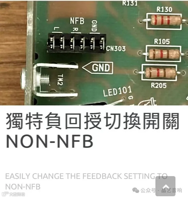 许多三极管扩大机在其设计中会使用负回授,负回授能抑制失真但相对也会降低放大率。TU-8900E 有一个可以调整的选项,藉由改变电路板上短插针的位置可以将电路结构更改为 NON-NFB,能让乐友?可以在没有负回授的线路下享受三极管最真实的音色。( NON-NFB 设置时增益约增加 8dB )