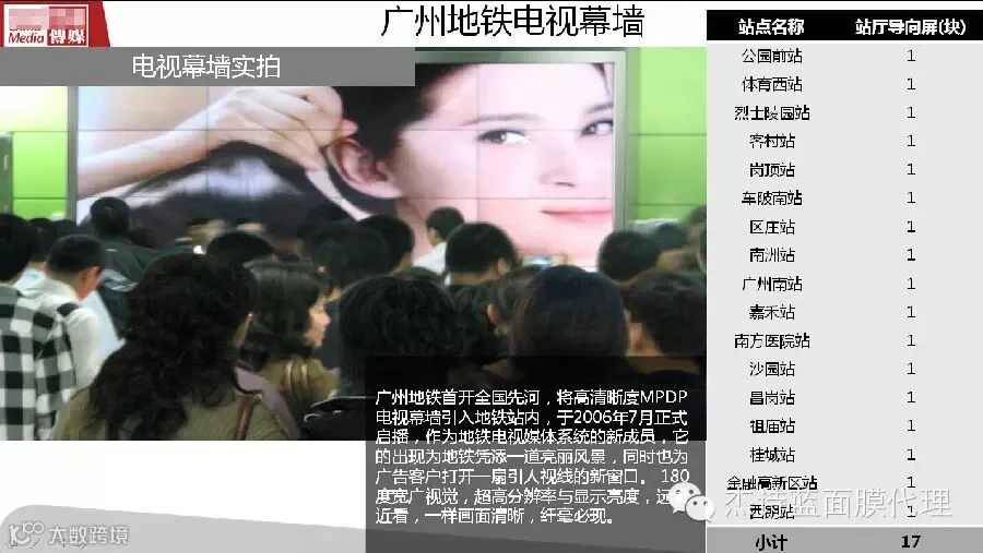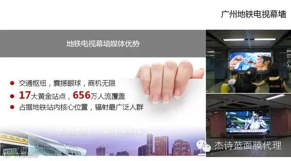 主流、交通枢纽,震撼眼球,17大黄金站点,656万人流覆盖,96次/天 ,连播28天,每天从地铁启动那一刻开始,每隔10分钟,就能带你领略一次杰诗蓝面膜的傲人风采!