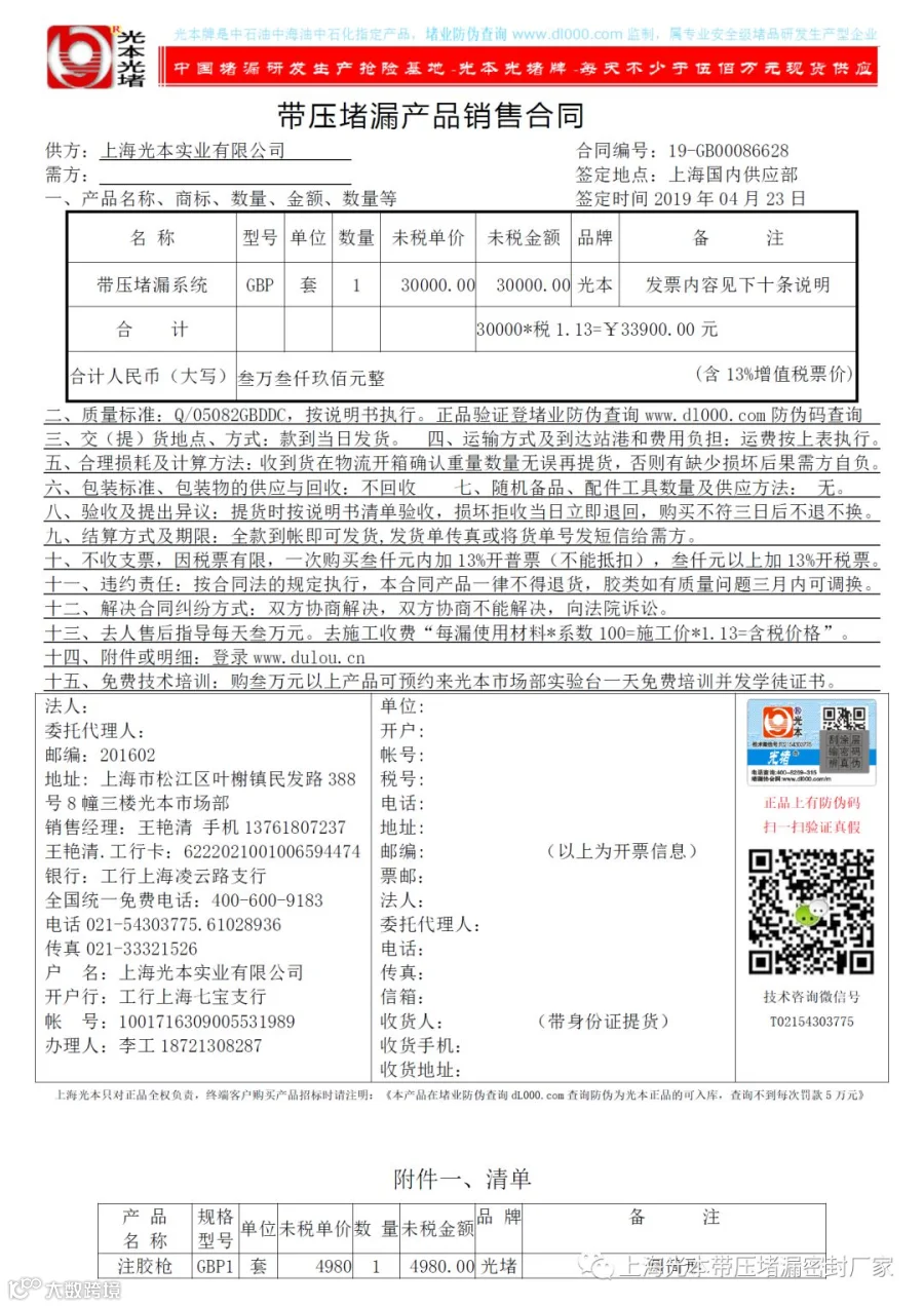 上海光本是合法的生产加工型企业,进入光本官网www.dulou.cn点击网站下方工商局徽标进入工商局电子执照,经营范围里有“加工”两字是生产制造型企业, 光本牌、光堵牌为中石油中石化中海油带压堵漏抢险保运装备指定供应商。