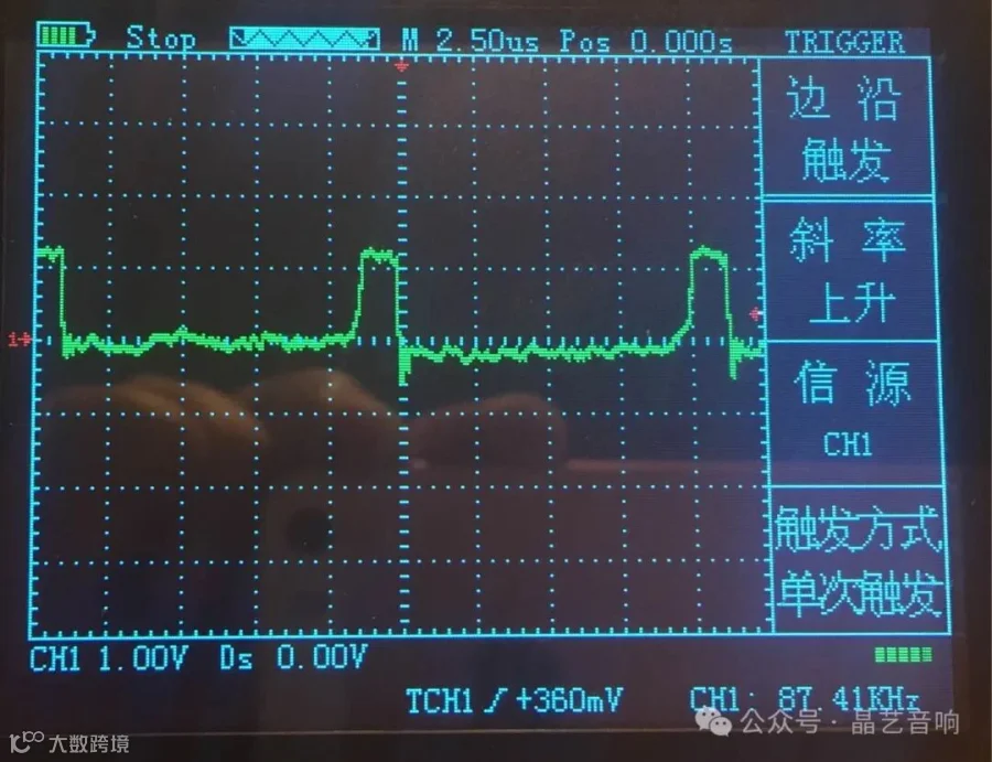 上图是一些有比较严重杂波污染下,在市电零线上检测到的高频波形。87KHZ 。如果你是使用CD唱机的,那么这个杂波对音质影响不少。