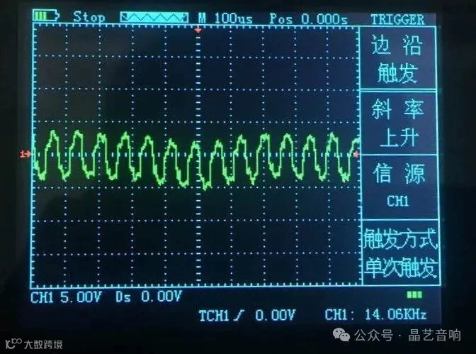 上图是在另一个城市小区,零线下测出的波型, 这个连续而且变化的而且频率更低(10K-100K)的干扰, 会对整个音响系统都会产生严重影响。