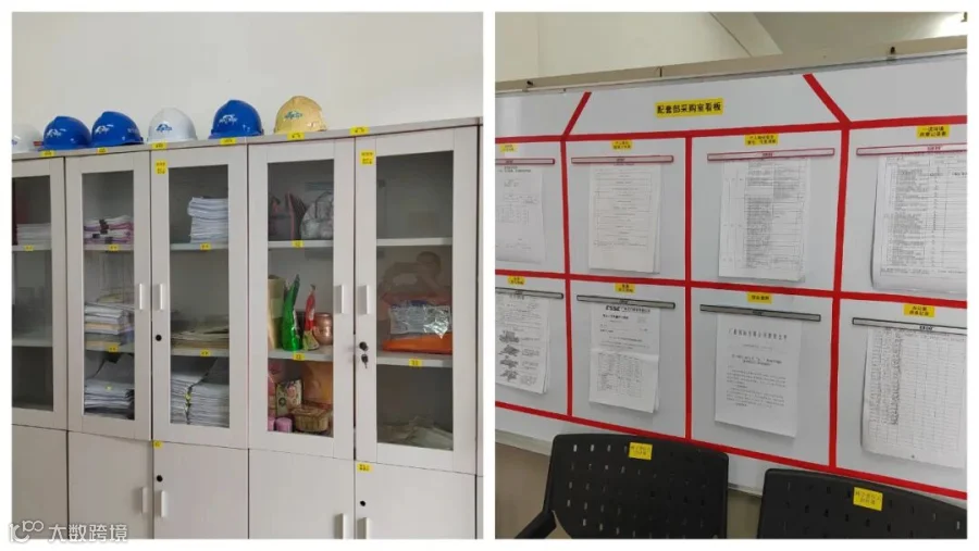 配套部办公室区域增加了看板,柜子内的办公用品、生活用品都进行定置并被贴好标识。
