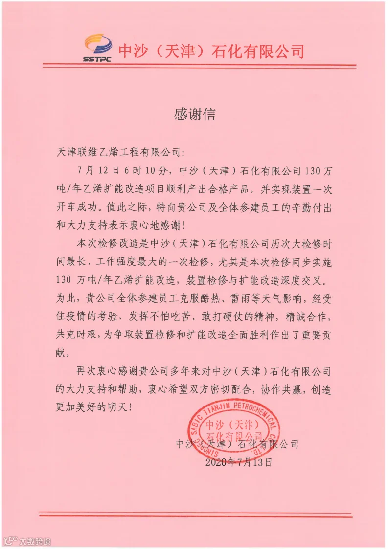 这标志着历时两个多月的天津地区停工检修改造工作胜利结束,联维公司完满完成了保运区域的大检修工作和中沙(天津)石化130万吨/年电仪扩能改造工作。