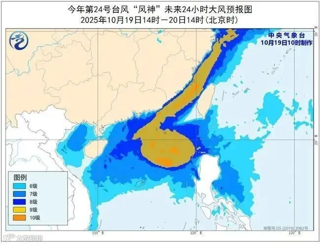 大风预报:19日14时至20日14时,台湾海峡、巴士海峡、南海北部和中部、西沙群岛、中沙群岛及黄岩岛附近海域、北部湾、琼州海峡、东海西部、浙江沿海、台湾沿海、福建沿海、广东沿海、广西沿海、海南岛沿海将有6-8级大风,阵风9-10级。