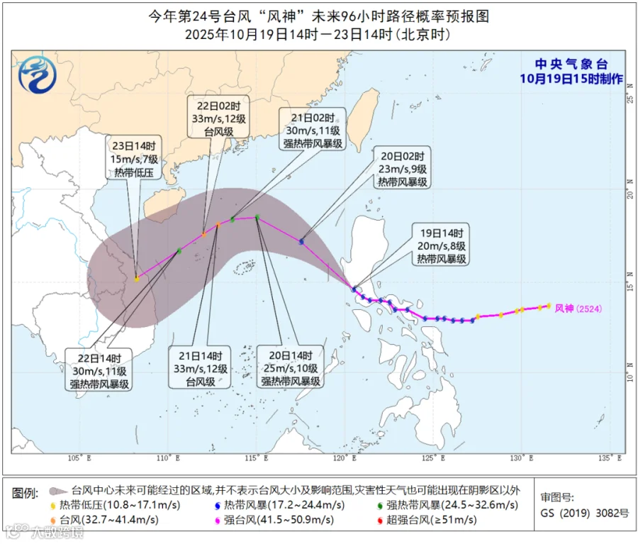 预计,“风神”将以每小时35公里左右的速度向西北方向移动,今天傍晚前后进入南海东部海面,强度逐渐加强,最强可达强热带风暴级或台风级(30-35米/秒,11-12级);21日白天开始受南下冷空气影响,在南海北部海面转向西南方向移动,强度逐渐减弱。