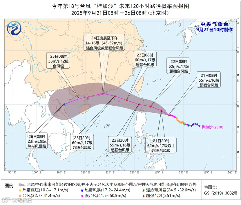 今年第18号台风“桦加沙”已于今天(21日)上午加强为超强台风级。根据中央气象台预测,“桦加沙”将以每小时15-20公里的速度继续向西偏北方向移动,强度还将有所增强,最强可达17级以上(62米/秒),22日穿过巴士海峡后,将于23日凌晨进入南海东北部海面,并将在24日凌晨至下午在广东沿海登陆,预计登陆时强度可达强台风级或超强台风级(14-16级,45-52米/秒)。