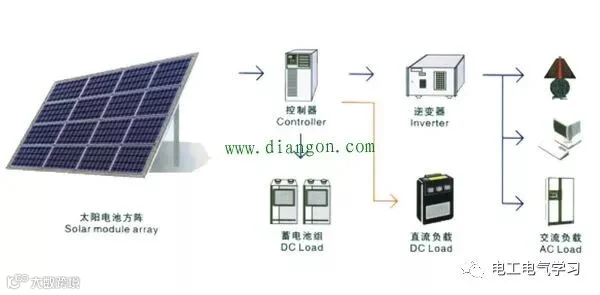 在太阳光的照射下,将太阳电池元件产生的电能通过控制器的控制给蓄电池充电或者在满足负载需求的情况下直接给负载供电,如果日照不足或者在夜间则由蓄电池在控制器的控制下给直流负载供电,对于含有交流负载的太阳能发电系统而言,还需要增加逆变器将直流电转换成交流电。