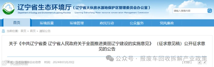 为贯彻落实《中共中央 国务院关于全面推进美丽中国建设的意见》,研究部署美丽辽宁建设相关工作,根据省委、省政府工作要求,省生态环境厅牵头起草了《中共辽宁省委 辽宁省人民政府关于全面推进美丽辽宁建设的实施意见》(征求意见稿),现公开征求意见。请于2024年3月27日前将意见建议传真至024-62780012,或将邮件发送至zhc.ssthjt@ln.gov.cn。
