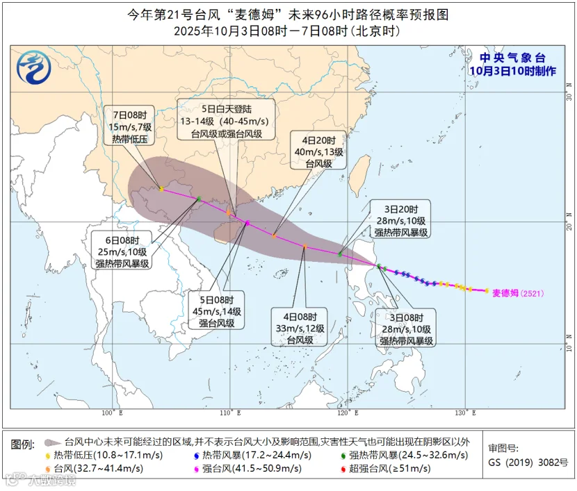 预计,“麦德姆”将以每小时30公里左右的速度向西偏北方向移动,将于今天白天穿过菲律宾吕宋岛,之后移入南海东部海面,逐渐向广东西部到海南岛东部一带沿海靠近,强度逐渐增强,最强可达强台风级(14-15级,42-48米/秒),将于5日白天在上述沿海登陆(台风级或强台风级,13-14级,40-45米/秒),登陆后强度逐渐减弱。
