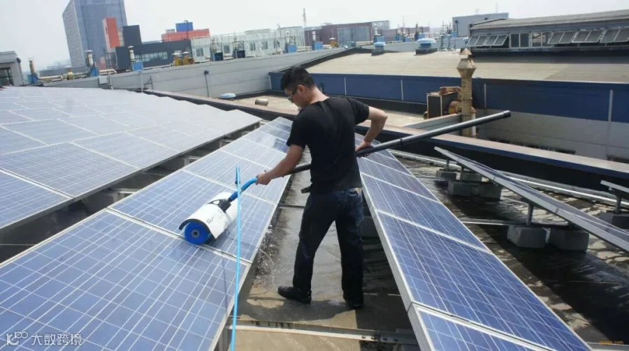 同时长时间没清洗的光伏板,表面会堆积大量的灰尘,即使是下过雨,由于光伏板的安装的倾角并不是很大,也会在在光伏板下半部分形成灰尘堆积,所以是需要人为的清洗。先用清水冲洗一下,然后用布条拖把擦拭一遍就好。