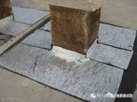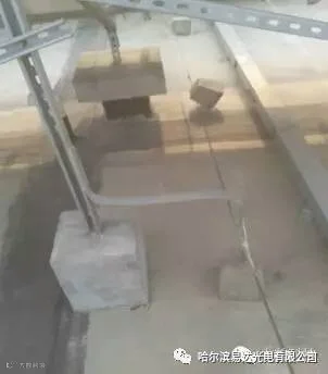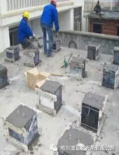 按照设计混凝土尺寸及设计要求准备浇筑用模具及钢筋网,钢筋网尺寸应小于混凝土模具尺寸。将准备好的模具架设与预埋膨胀挂钩外围,保证每排模具上下边均在一条直线上。将植筋钢筋网与膨胀挂钩形成连接后往模具中注入混泥土进行浇筑,浇筑过程需用振荡器将混凝土捣实,直至与模具上平面齐平。利用模板定位并埋入紧固螺丝,将混凝土基础表面抹平。待混凝土固化后,拆除模具,在基础表面用水泥和固化胶配置好涂刷一遍,保证基础表面平整、光滑、美观、无气泡、气孔(参考下图)
