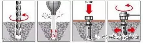 b) 把膨胀螺栓套件一起下到孔内,不要把螺帽拧掉,防止孔钻的比较深时螺栓掉进孔内而不好往外取。接着把螺帽拧紧,感觉膨胀螺栓比较紧而不松动后再拧下螺帽。