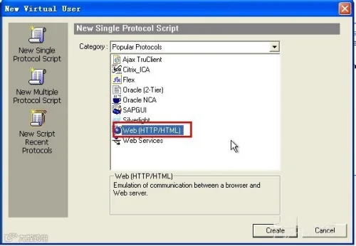 2.使用“Web(http/html)”进行创建,此时相当于选择的录制协议就是http协议,这个协议适合录制web的应用程序,点击后在弹出框“Url Address”中键入要录制网页的地址如“http://www.baidu.com”输入后点击下方【OK】按钮。注:一定不要忘记输入http://