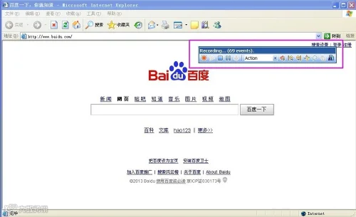 4.脚本初始化创建完成后就开始录制脚本了,下图中红色的是一个录制的悬浮窗,后面的网页百度站点是设置的录制站点,在悬浮框上events前面显示的了当前录制的事件数,方框还支持暂停、开始、结束录制等功能,还可以在方框的右边选择添加一些事务。